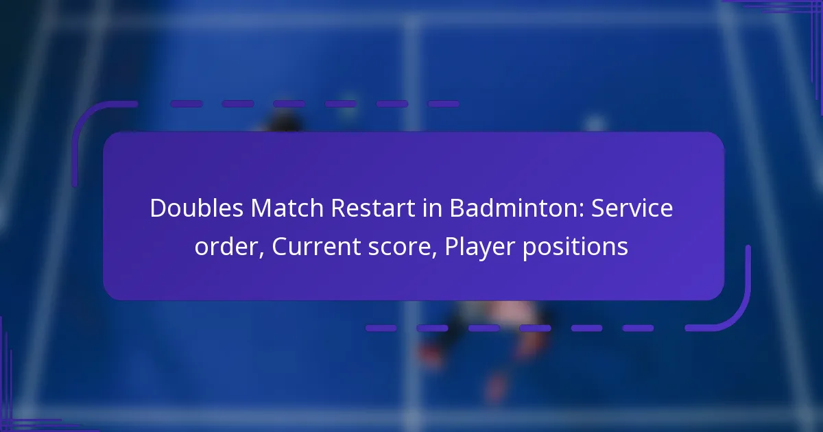 During a doubles match restart in badminton, the current score must be accurately recorded and communicated to ensure fair play. This involves understanding the service order, player positions, and maintaining clear communication among players and officials.